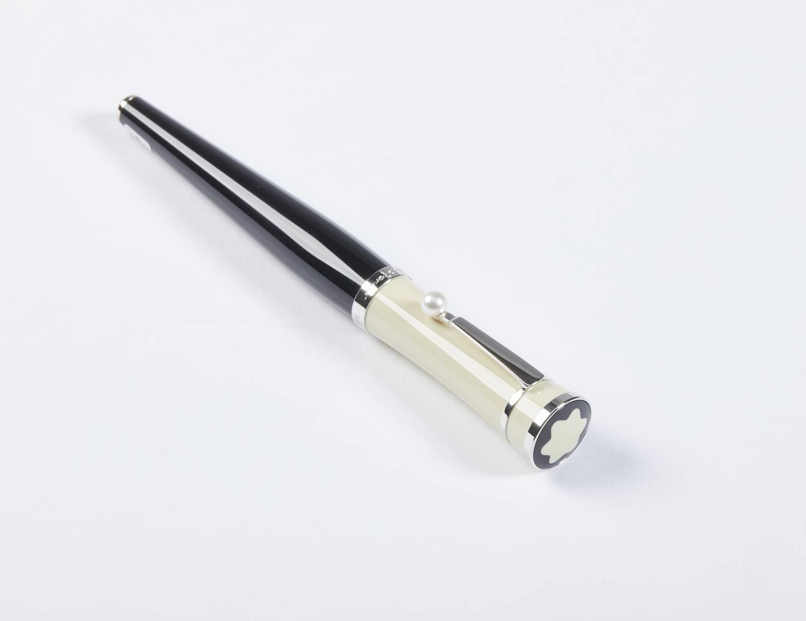 Il corpo è realizzato in resina nera pregiata, cappuccio in pregiata resina color crema, clip incastonata con una perla Akoja bianca rotonda, finitura placcate platino, anello del cappuccio impreziosito dalla firma "Greta Garbo".